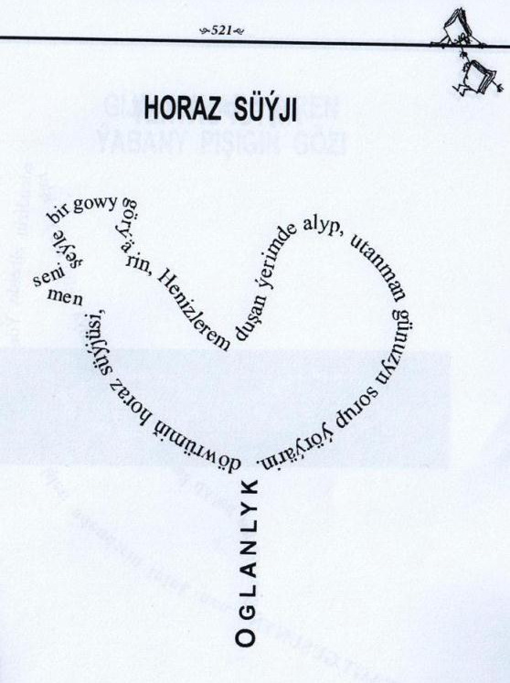 Back in the early nineties, Hemra Shirov became interested in visual versification, an unusual poetic genre. His works of figured verses “Pähim basganjaklary” (Levels of Understanding), “Awtoportret” (Self-Portrait), “Gar adam” (Snowman), “Horaz süýji” (Lollipop Cockrel) and many others are something that has not yet been seen in the traditional genre of Turkmen poetry. Visual verse is a very diverse artistic phenomenon that is at the intersection of poetry, graphics and painting. They tried to write in this genre back in antiquity. It attracted particular interest from poets in the 17th century, for example, the poem “Blessing” by Simeon of Polotsk in the shape of a heart. G. Apollinaire and Theodore Gautier especially loved this genre. The graphic forms of Hemra Shirov’s poems are supported by cheerful or philosophical content, but even in the most lightweight and entertaining works, one can read the author’s serious attitude towards certain phenomena of life and creativity.