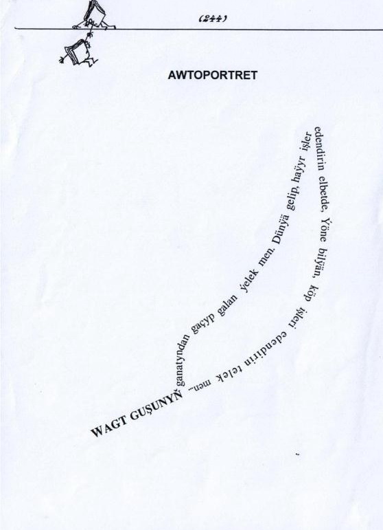 Working in various literary genres, he always strived to keep up with the times to explore new spaces for creation. It is not surprising that his work includes many poems created in the genre of visual versification. We can say that he is the only Turkmen poet who writes in this genre. For example, have you ever seen a carpet that a woman wants to sell through the eyes of her little son? Here it is, in the poet’s verse, instead of gels “ornaments”, the boy sees köke “cookies”, kemput “candy”, and şokolad “chocolate bars” on it.