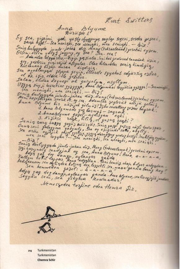 A page from literary project “Anna Blume” with translation of poem “Anna Blume” by Kurt Schwitters to Turkmen by Hemra Shirov