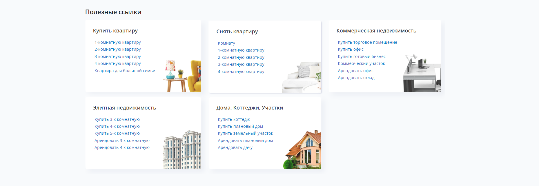 Также на Главной странице в разделе Полезные ссылки вы самостоятельно можете сделать выбор в подразделах: Купить квартиру, Снять квартиру, Коммерческая недвижимость, Элитная недвижимость, Дома, Коттеджи, участки и Премиум объявления.
