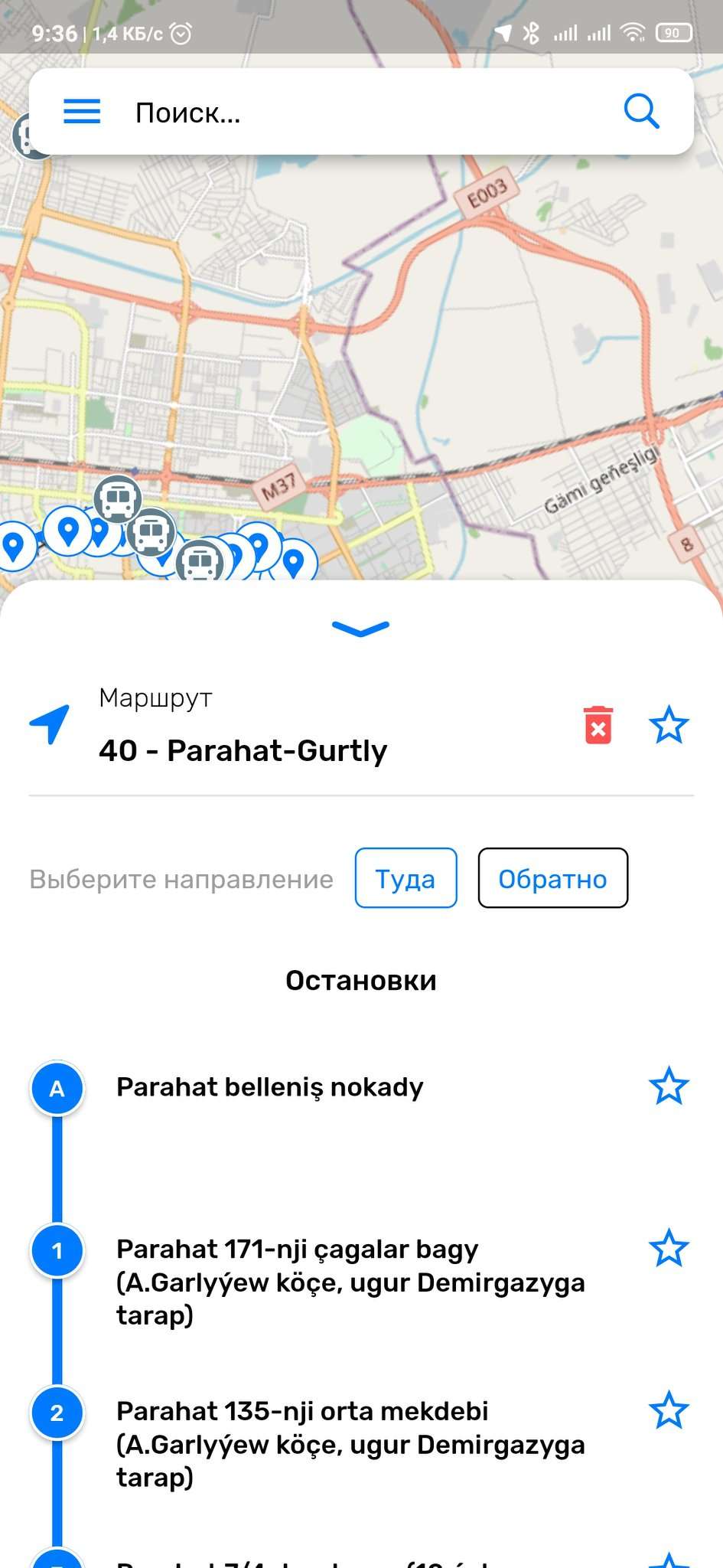 Если во всплывающем «Меню» приложения нажать «Маршруты» выйдет полный (обновленный в соответствии с настоящим временем) список всех действующих городских маршрутов. С точной схемой направлений автобусов можно ознакомиться, выбрав нужный вам номер рейса. Для удобства пользователей приложения, остановки по пути следования маршрута разделены на две категории: синим цветом выделен маршрут «Туда», а зеленым «Обратно».