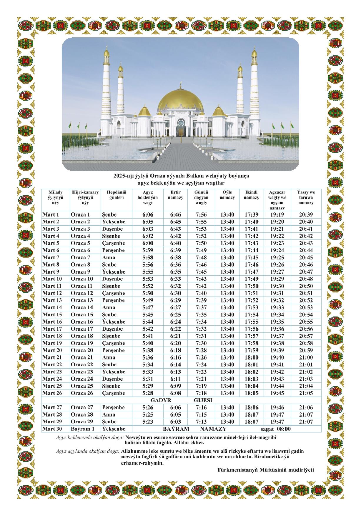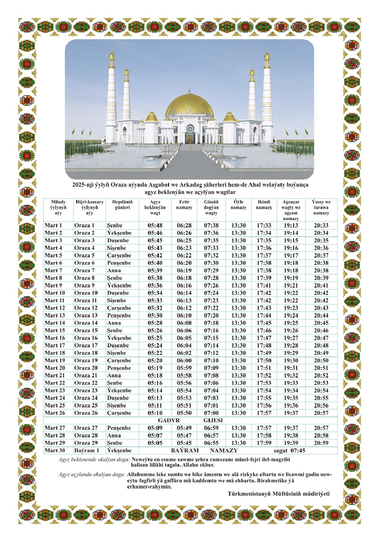 В разных регионах Туркменистана время начала и окончания поста немного отличается из-за географического расположения. В таблице выше представлено расписание для основных регионов страны.