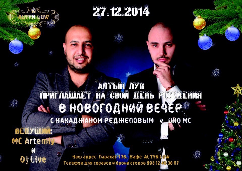 Приглашаем всех провести Новогодний вечер и отметить день рождение нашего заведения вместе. С нами в этот вечер будут зажигать Какджан Реджепов и Uno MC. Также вас ждут интересные конкурсы от MC Artemiy.