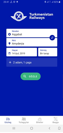 Ykjam programma üpjünçiligi açylan badyna “Gözleg” menýusy saýlanylgy durýar. Gözleg menýusynda “Nireden”, “Nirä”, “Haçan”, “Görnüş” we adam sany setirleri ýerleşdirilen. Bu setirlere zerur maglumatlary girizip, degişli ugurlar boýunça gözlegi ýerine ýetirip bilersiňiz. Meselem: Aşgabatdan Amyderýa çenli, 14-nji iýulda, 1 tarapyna, 2 adam we 1 çaga. “Gözle” düwmesine basyň.