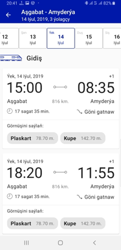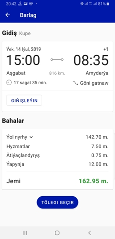 “Gözle” düwmesine basylandan soňra, şol senede, girizilen maglumatlara laýyklykda otlynyň ugurlary, ugraýan wagtlary, ýoluň uzaklygy, barýan wagty ýaly maglumatlar sanaw görnüşde çykar. Şeýle-de, bahasy bilen birlikde otlynyň görnüşi hem çykar: plaskart we kupe. Ugurlaryň üstüne basyp, jikme-jik maglumatlary hem almak bolar. Ugramakçy wagtyňyzy saýlanyňyzdan soň, otlynyň görnüşiniň üstüne basmaly.
