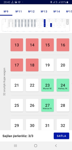 Indiki penjirelerde otlyda ýer saýlanýar. Wagonyň boş ýerleri barada maglumatlar suratda interaktiw reňkler bilen nyşanlanan. Oturjak ýeriňizi “Saýla” düwmesi arkaly saýlap bilersiňiz.
